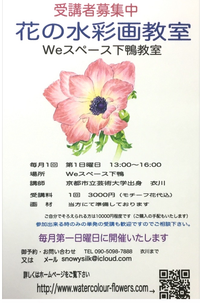 京都市左京区にある“花の水彩画教室”では、随時見学会を行っております。皆様の新しい発見や楽しみに出会えるきっかけになれたら嬉しいです。地域の皆様の憩いの場所でいられるよう、楽しくて明るい教室として活動し、皆様にとって有意義な時間の一部になれますように。また、“花の水彩画教室”はInstagramにてオーダーメイドの作品販売も行っております。ぜひこちらもチェックしてみてください。